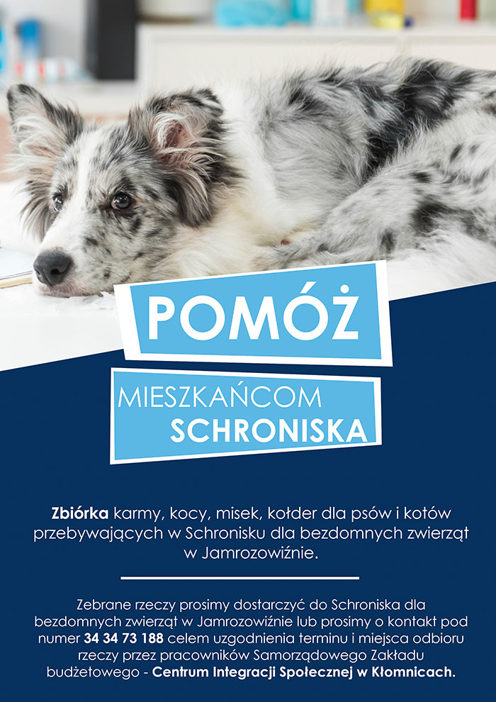 Zebrane rzeczy prosimy dostarczyć do Schroniska dla bezdomnych zwierząt w Jamrozowiźnie lub prosimy o kontakt pod numer 34 34 73 188 celem uzgodnienia terminu i miejsca odbioru rzeczy przez pracowników Samorządowego Zakładu budżetowego – Centrum Integracji Społecznej w Kłomnicach.
